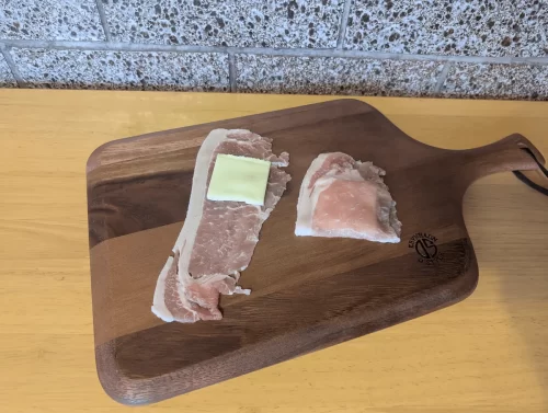 2)チーズを乗せたロース肉を半分に折る(写真右)