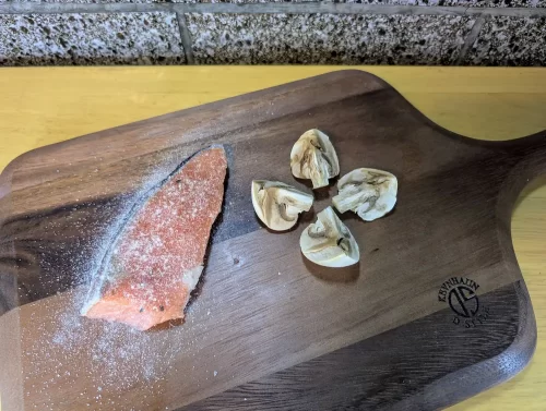 1)鮭にクレージーソルトで下味を付け小麦粉をまぶす、マッシュルームは縦4等分に切り分ける