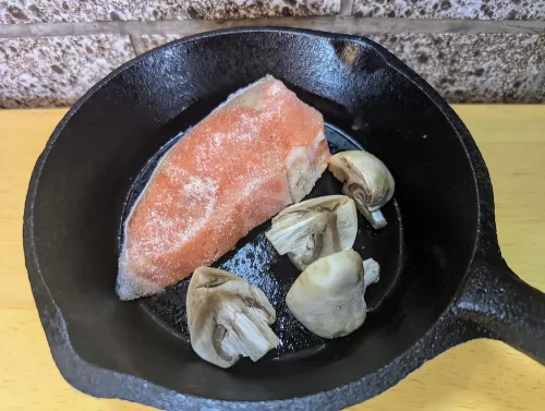 3)バターが溶けたら鮭とマッシュルーム入れ火が通るまでソテーする