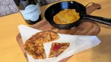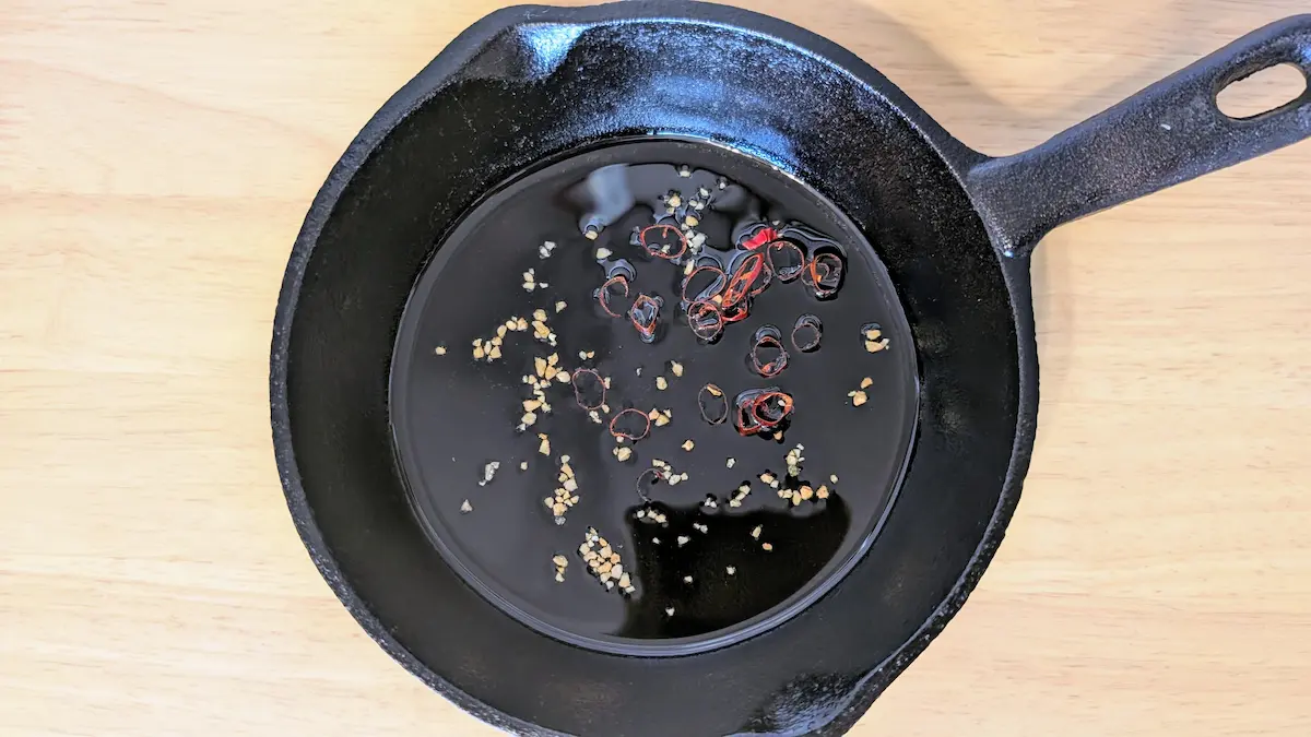2)スキレットに上記の分量のオリーブオイル、赤唐辛子、粗挽きガーリックを入れ弱火にかけます。
