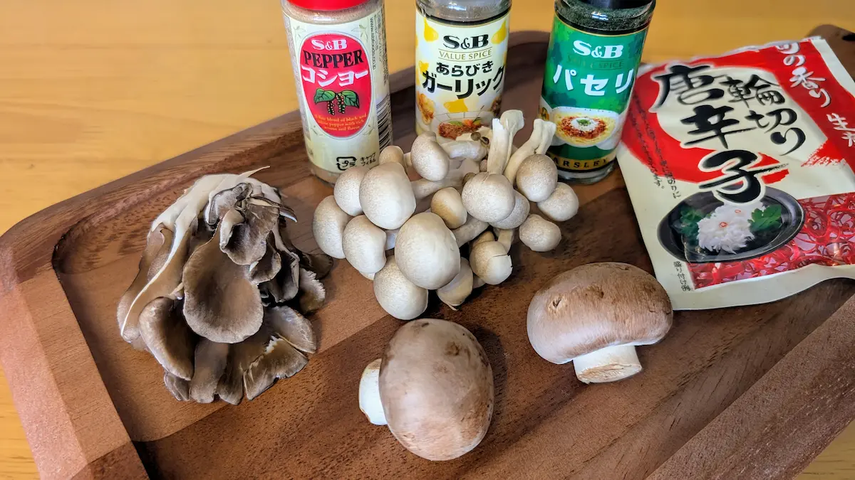 ※ きのこ種類はこれ以外に生しいたけやエリンギでも可、お好みのきのこを3種類以上セレクトしてください。きのこの分量は目安です、スキレットに一度に入る量であれば適当で大丈夫です。