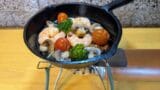 スキレットを火から降ろします、スキレットの持ち手はかなり熱くなっているので素手では触らず耐熱グローブなどで掴んでください。