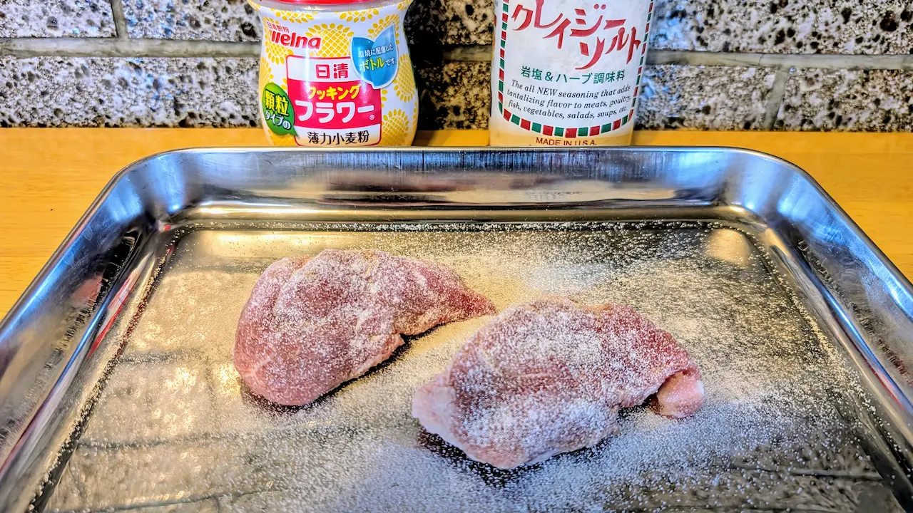 ヒレ肉にクレージーソルトで下味を付け、小麦粉をまぶします。