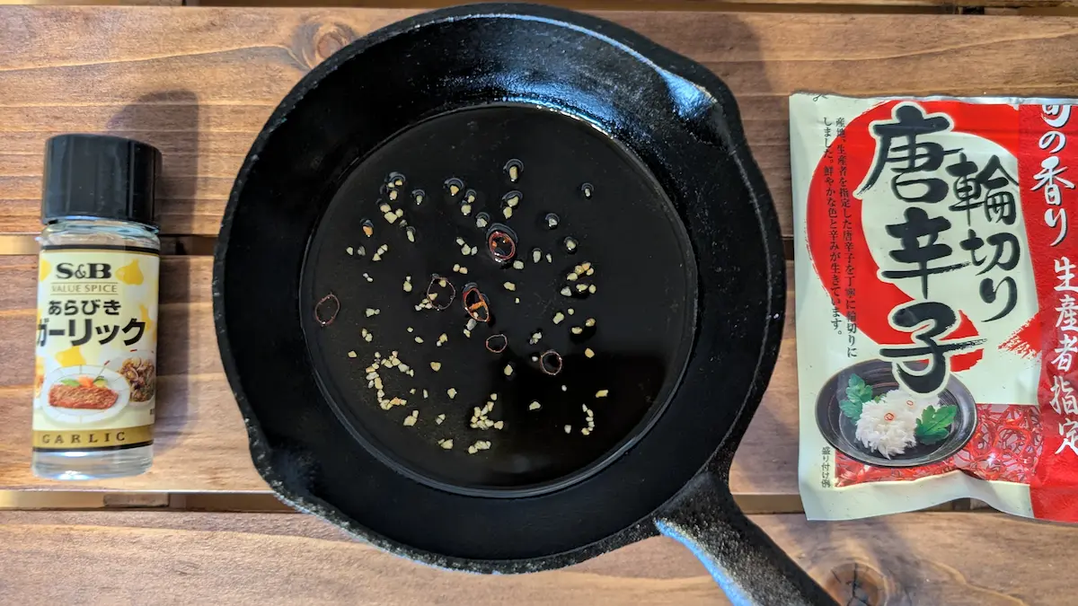 熱する前のスキレットに、オリーブオイル大さじ1杯、粗挽きガーリック二振り、唐辛子の輪切り一摘みを入れます。