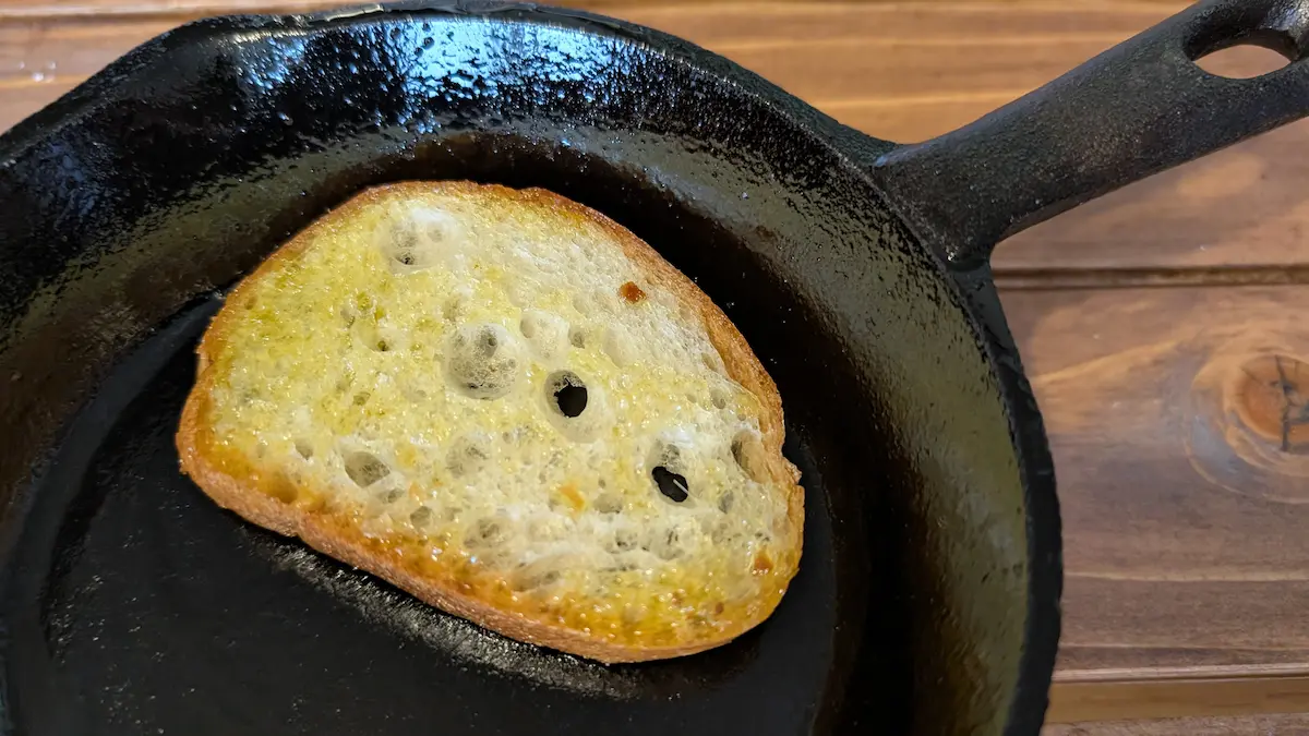 タコとトマトを食べ終わったら、スキレットに残ったオリーブオイルをバゲットにつけて食べてみてください。ガーリックと唐辛子の風味にタコの旨味も加わったオイルはメチャ旨ですよ。