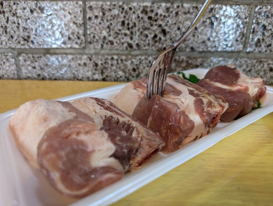 3)スペアリブに味がしみこみ易くするため、およそ1cm間隔でフォークを刺して穴を空ける。