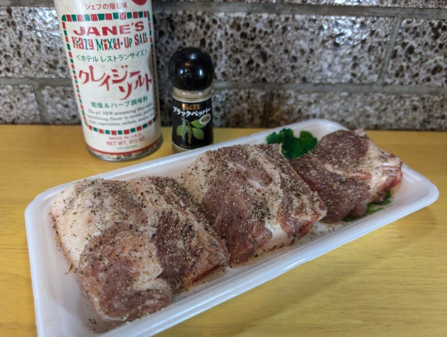 4)肉に調味料を刷り込むようにして下味を付ける、今回はクレジーソルトと粗挽きブラックペッパーを使用。10分ほど馴染ませ水気がでたらキッチンペーパーで吸い取る。