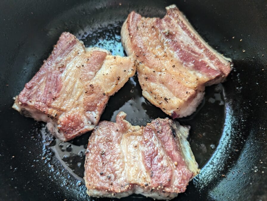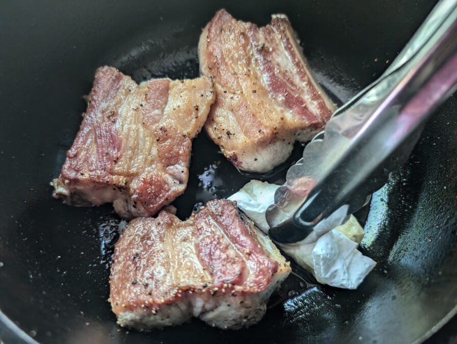 1)サービングポットにスペアリブを入れ、全面に焼き色を付ける。