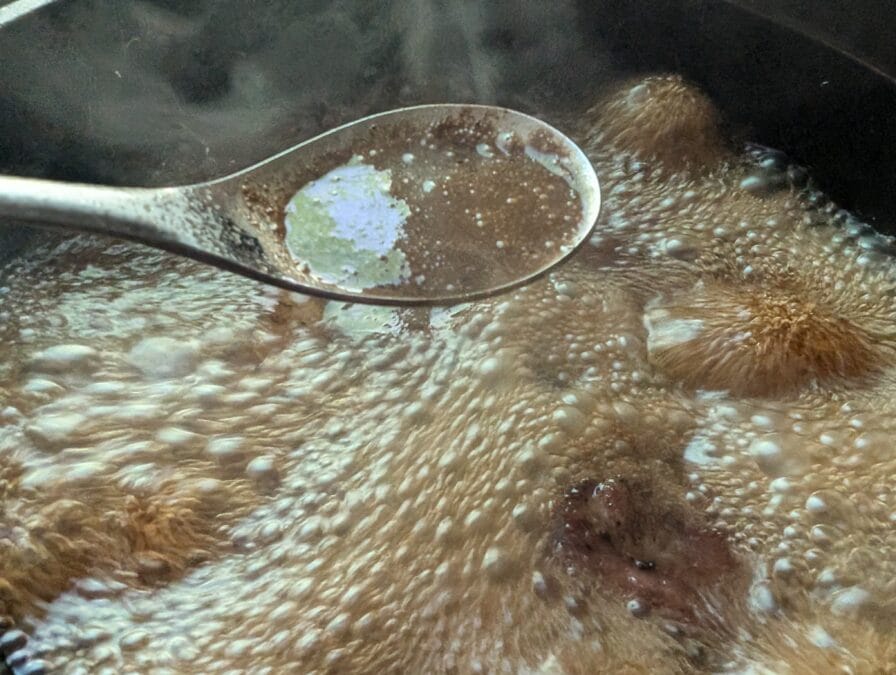 3)コーラ500mlを鍋に入れ中火で沸騰させる。泡と共に灰汁が出るので取り除く。