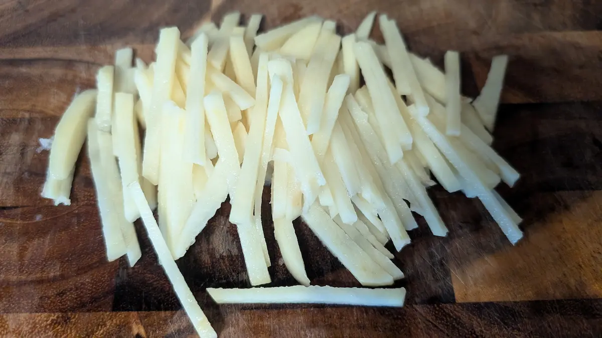 3mm幅の輪切りにし、さらに3mm幅にスライスして棒状にします。