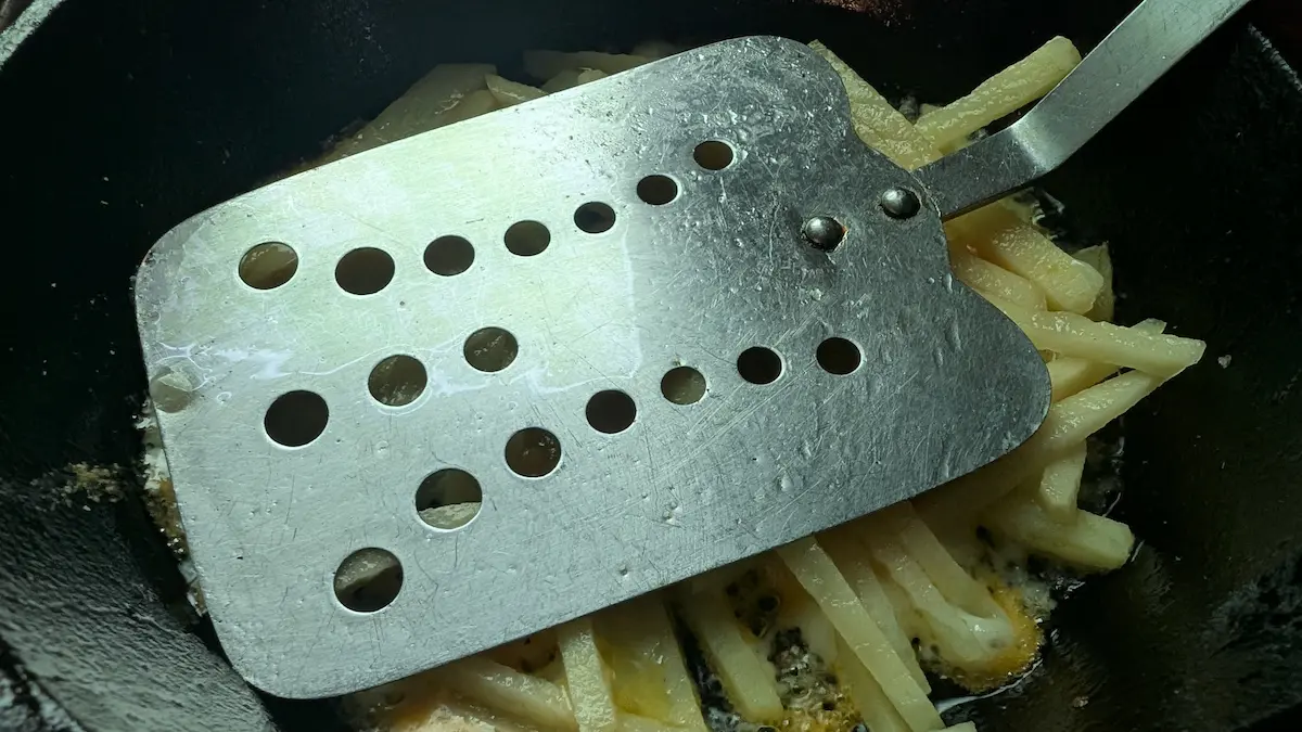 キャンプ時でフライパン返しが無いときはシェラカップやマグカップの底を使って押し付けます。